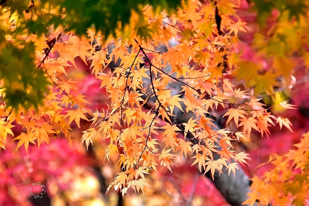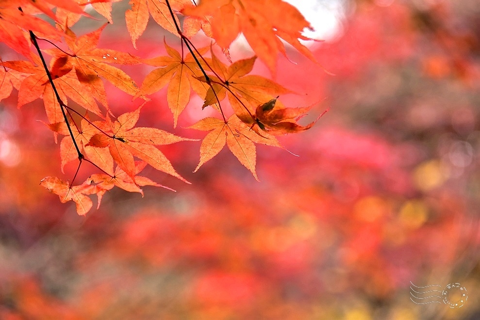 楓樹,或該稱之為槭樹,品種之多,眼花撩亂,很顯然周邊種好種滿,加上其他變葉木,整個山頭層層疊疊,色彩氾濫,但真要圈進鏡頭,構圖上卻往往流於龐雜,沒有想像中容易。
