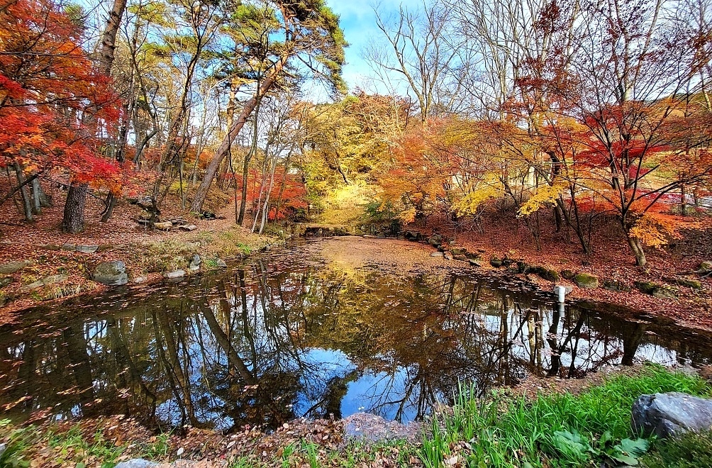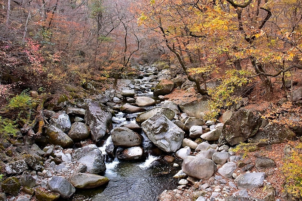 當遊覽車沿著蜿蜒道路上山的時候,沿途滿山金紅交錯的景色已經讓人驚叫連連了,尤其是順著山道的【紅流洞溪谷】——落葉染紅溪谷的絕美景致,可惜無法下車親近。