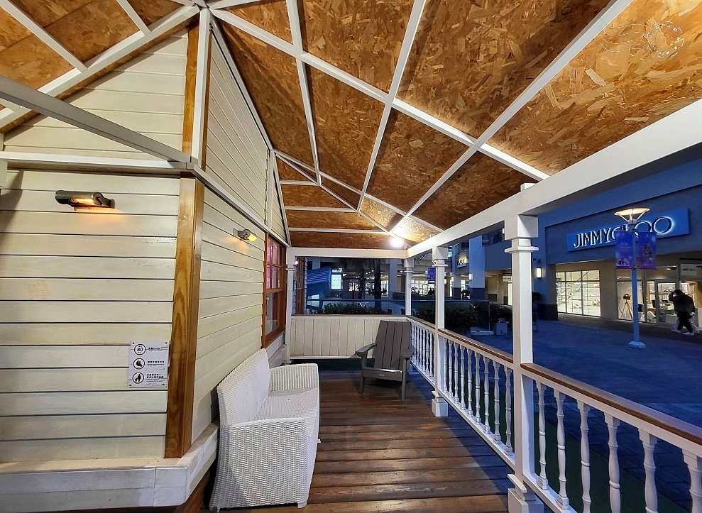 ↓點燈時間每日16:30,來的時候天色尚早。YA!從「一期」入口,也就是機捷通道這邊進場,充滿美式風情的木屋已經出現了。